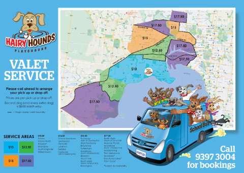 Hairy Hounds Playground offers a valet service with morning pick-up, evening drop-off – or both – for your convenience. Valet service areas are indicated on the map below. Click on the image for a larger view.